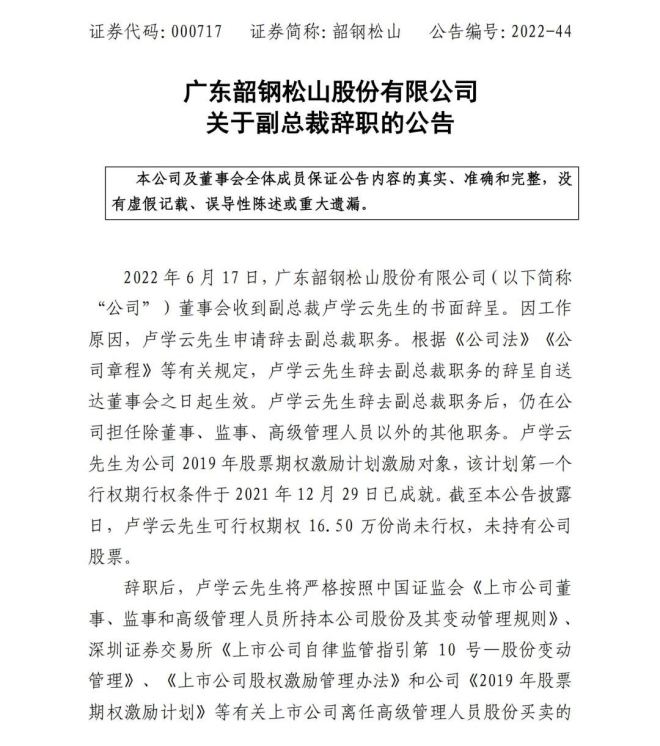 2022年6月17日,廣東韶鋼鬆山股份有限公司董事會收到副總裁盧學雲的書麵辭呈。因工作原因,盧學雲申請辭去副總裁職務。根據《公司法》《公司章程》等有關規定,盧學雲辭去副總裁職務的辭呈自送達董事會之日起生效。