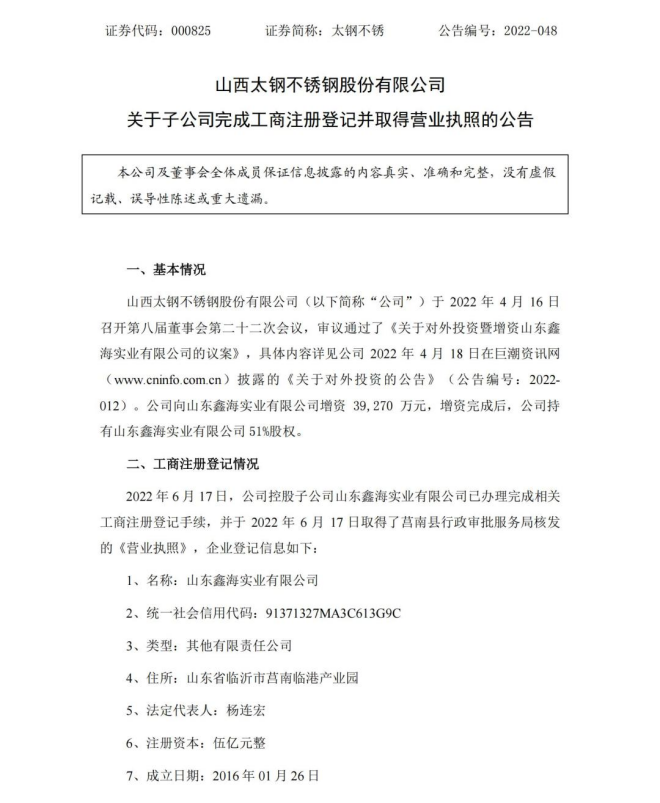 6月21日,山西太鋼不鏽鋼股份有限公司發布公告稱,2022年6月17日,公司控股子公司山東鑫海實業有限公司已辦理完成相關工商注冊登記手續,並於2022年6月17日取得了莒南縣行政審批服務局核發的《營業執照》。