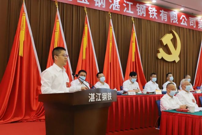 湛江鋼鐵公司黨委書記、董事長劉代德作題為《牢記鋼鐵報國初心使命 爭創世界一流偉大企業 加快建設最具競爭力的綠色碳鋼製造基地》的黨委報告。