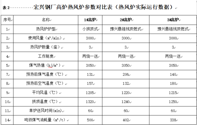 永鋒鋼鐵和秦皇島宏興鋼鐵公司豫興熱風爐就是通過這些特殊的結構和性能來實現高效生產、高風溫的;實現了氮氧化物低於50mg/m3的超低排放,尤其是噸鐵煤氣超低消耗均為322.9m3~370m3,創造了中國煉鐵曆史紀錄;比傳統的小帽子頂燃式熱風爐噸鐵煤氣消耗量為463.1m3~500m3降低了98m3~162m3,煤氣節省率分別降低了19.6%~32.4%,熱風爐燃燒產生的二氧化碳排放降低20%以上。