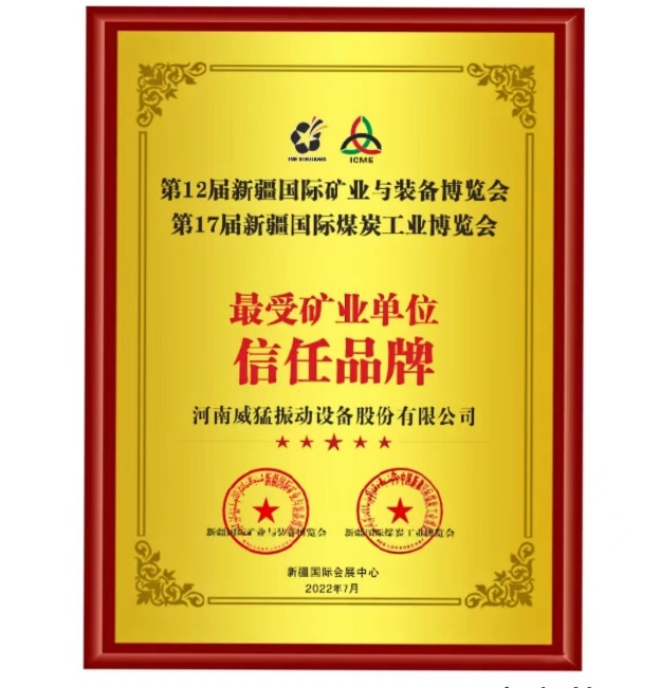 2022年7月16日至18日,在新疆烏魯木齊市舉辦的第12屆新疆 國際礦業與裝備博覽會暨第17屆新疆國際煤炭工業博覽會上,河南威猛振動設備股份有限公司(下文簡稱威猛股份)榮獲了博覽會組委會頒發的“最受礦業單位信任品牌”殊榮。
