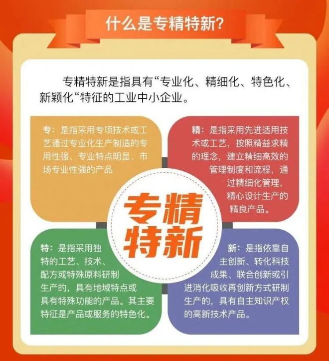 國家級專精特新“小巨人”企業的篩選和審核由工信部負責,是國家為鼓勵中小企業實現專業化運營、精細化產出、特色化工藝和新穎化產品四方麵發展而專門設立的榮譽獎項,同時也是全國中小企業評定工作中最高等級、最具權威的榮譽稱號。評選的企業均是專注於細分市場、創新能力強、市場占有率高、掌握關鍵核心技術、成長性高的“排頭兵”企業。