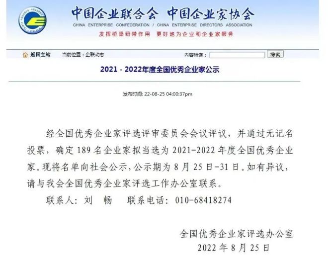 近日,中國企業家聯合會、中國企業家協會網站發布《2021—2022年度全國優秀企業家公示》。經全國優秀企業家評選評審委員會會議評議,並通過無記名投票,全國優秀企業家評選辦公室確定189名企業家擬當選為2021-2022年度全國優秀企業家。其中,包頭鋼鐵(集團)有限公司黨委書記、董事長魏栓師上榜。