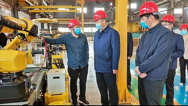 威猛股份總經理王思民(左1)陪同新鄉市領導視察公司研發的焊接機器人“小萌”