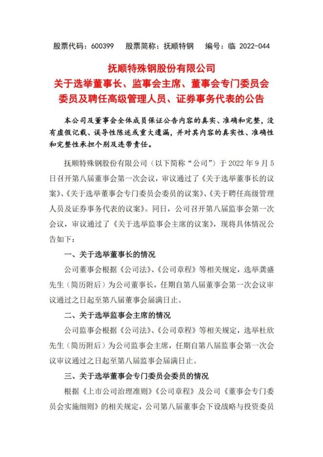 撫順特殊鋼股份有限公司(以下簡稱公司)於2022年9月5日召開第八屆董事會第一次會議,審議通過了《關於選舉董事長的議案》《關於選舉董事會專門委員會委員的議案》《關於聘任高級管理人員及證券事務代表的議案》。同日,公司召開第八屆監事會第一次會議,審議通過了《關於選舉監事會主席的議案》。選舉、聘任結果如下: