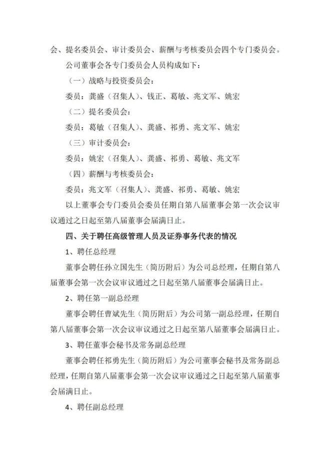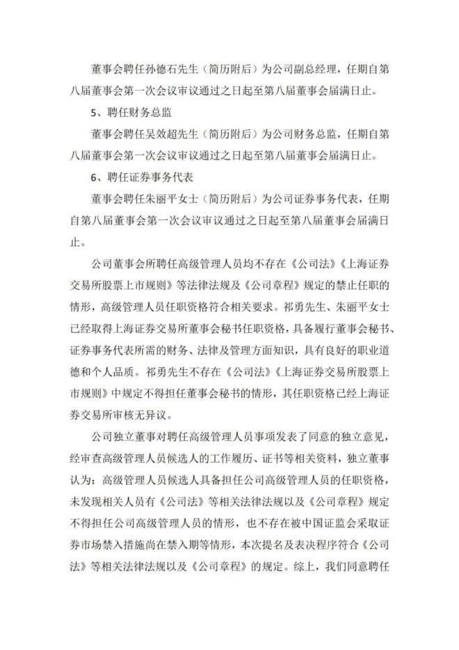 董事會聘任祁勇先生(簡曆附後)為公司董事會秘書及常務副總經理,任期自第八屆董事會第一次會議審議通過之日起至第八屆董事會屆滿日止。