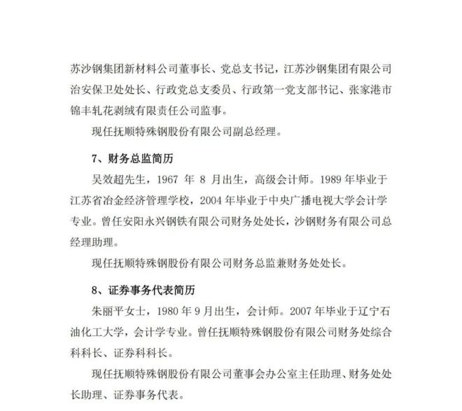 朱麗平女士,1980年9月出生,會計師。2007年畢業於遼寧石油化工大學,會計學專業。曾任撫順特殊鋼股份有限公司財務處綜合科科長、證券科科長。