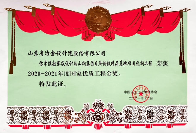 由山冶設計勘察設計的山鋼集團日照鋼鐵精品基地項目軋鋼工程榮獲2020-2021年度國家優質工程金獎。