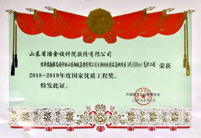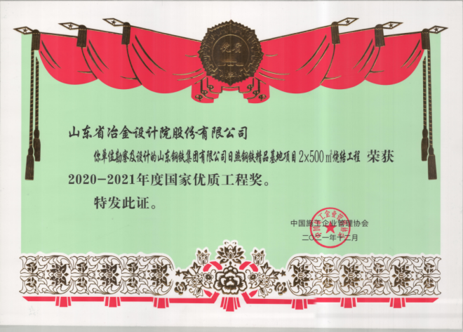 此外,山冶設計總包的日照精品基地燒結工程和高爐工程分別獲得2020-2021年度和2018-2019年度國家優質工程獎。