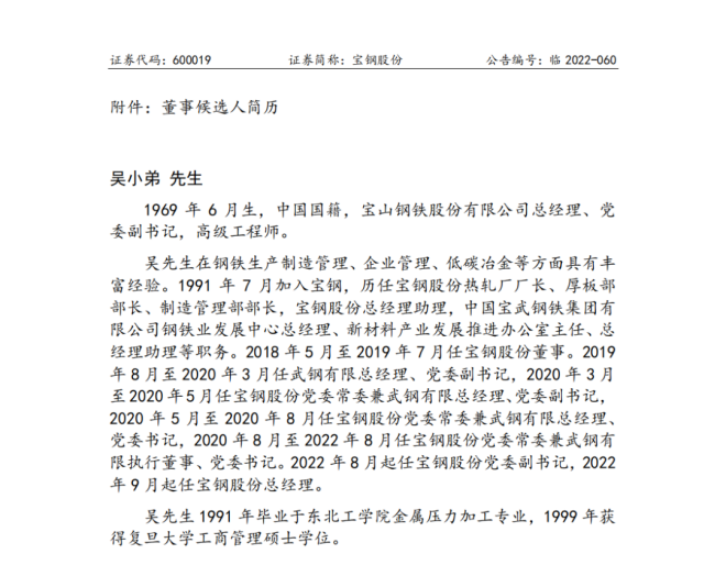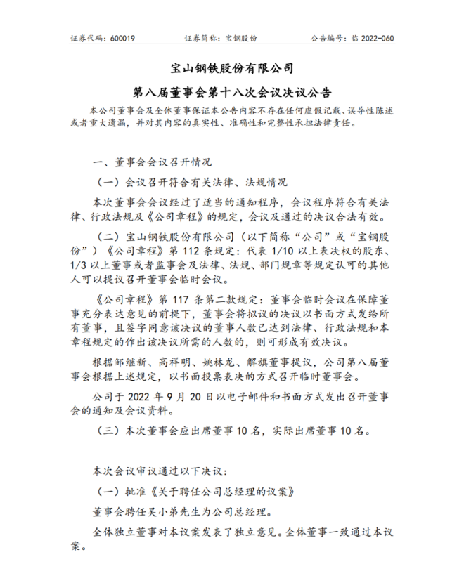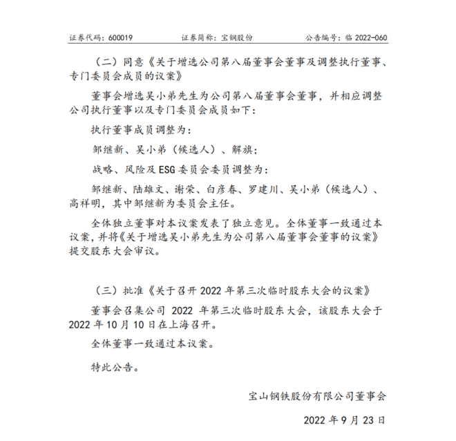 9月23日,寶鋼股份有限公司(以下簡稱公司)發布公告稱,因工作另有安排,該公司董事、總經理盛更紅先生向董事會提出辭去公司第八屆董事會董事、董dong事shi會hui專zhuan門men委wei員yuan會hui相xiang關guan職zhi務wu以yi及ji總zong經jing理li職zhi務wu。公gong司si董dong事shi會hui聘pin任ren吳wu小xiao弟di先xian生sheng為wei公gong司si總zong經jing理li。董dong事shi會hui增zeng選xuan吳wu小xiao弟di先xian生sheng為wei公gong司si第di八ba屆jie董dong事shi會hui董dong事shi,並bing相xiang應ying調tiao整zheng公gong司si執zhi行xing董dong事shi以yi及ji專zhuan門men委wei員yuan會hui成cheng員yuan如ru下xia:執行董事成員調整為鄒繼新、吳小弟(候選人)、解旗;戰略、風險及ESG委員會委員調整為鄒繼新、陸雄文、謝榮、白彥春、羅建川、吳小弟(候選人)、高祥明,其中鄒繼新為委員會主任。