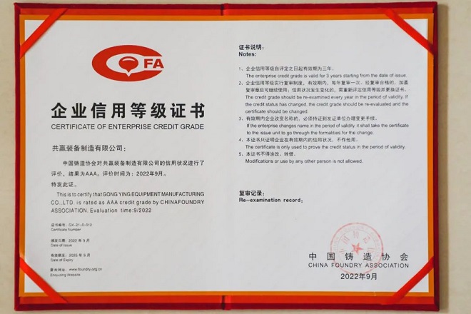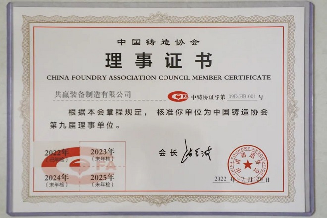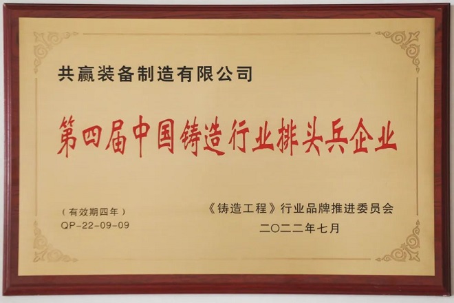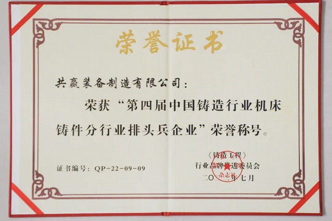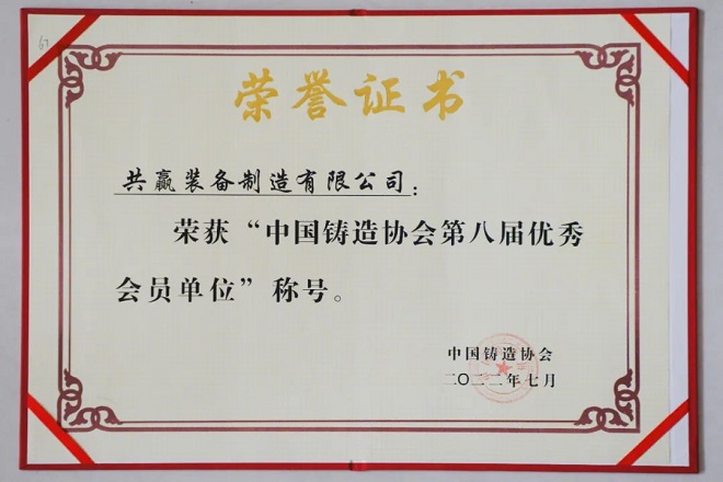 共贏裝備憑借企業綜合實力及多年來在鑄造行業取得的新成就,榮獲第四屆中國鑄造行業排頭兵企業、第四屆中國鑄造行業機床鑄件分行業排頭兵企業、企業信用評價AAA級信用企業、中國鑄造協會第九屆理事單位、中國鑄造協會第八屆優秀會員單位多項殊榮。共贏裝備副總經理周明榮獲中國鑄造行業優秀青年企業家稱號。