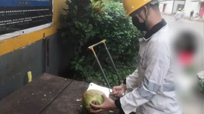 圖|印尼小夥勞比在為中國師傅加工椰子