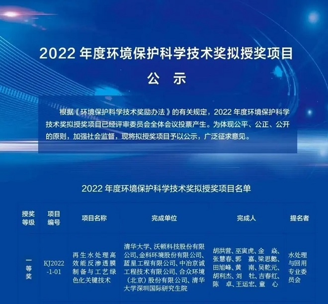 近日,中冶京誠參與申報的《再生水處理高效能反滲透膜製備與工藝綠色化關鍵技術》以總成績第一的成績榮獲中國環境科學學會“2022年度環境保護科學技術獎”一等獎,實現公司在國家環保科技領域最高獎項評選中的曆史突破。