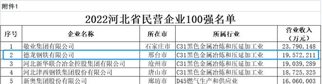 德龍鋼鐵集團榮登河北民營企業百強第二位