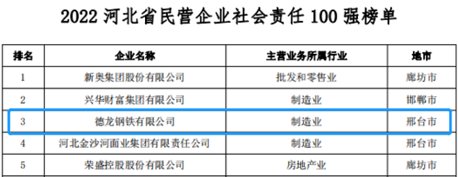 11月2日,河北省工商聯係統學習貫徹黨的二十大精神會議暨助推民營經濟高質量發展大會上,發布2022河北省民營企業100強、製造業民營企業100強名單、民營企業社會責任100強榜單及分析報告,其中,德龍鋼鐵集團以營業收入1957.22億元,位列省民營企業100強第2位,較2021年上升3位;位列製造業民營企業100強第2名,較2021年上升2位;榮登民營企業社會責任100強第3名。