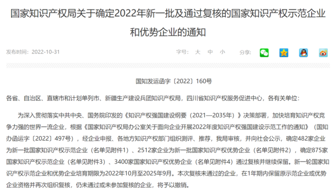 近日,國家知識產權局發布了《關於確定2022年新一批及通過複核的國家知識產權示範企業和優勢企業的通知》,南鋼順利通過“國家知識產權示範企業”複核,該項榮譽繼續保持,培育保護期順延至2025年9月。