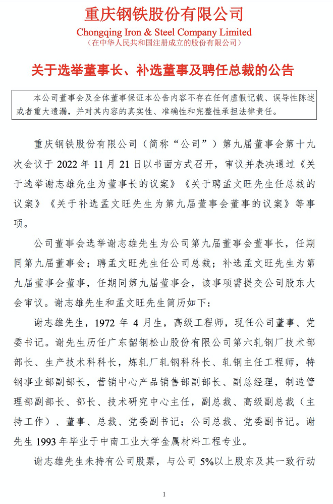 11月22日,重慶鋼鐵發布了《關於選舉董事長、補選董事及聘任總裁的公告》(以下簡稱《公告》)。