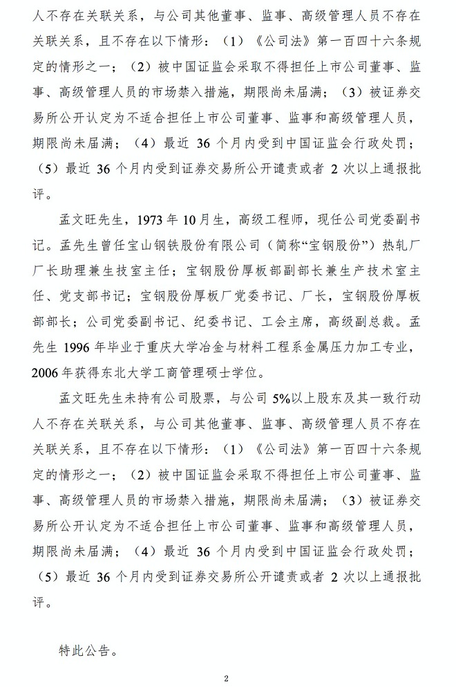 孟文旺先生,1973年10月生,高級工程師,現任公司黨委副書記。孟先生曾任寶山鋼鐵股份有限公司(簡稱“寶鋼股份”)熱軋廠廠長助理兼生技室主任;寶鋼股份厚板部副部長兼生產技術室主任、黨支部書記;寶鋼股份厚板廠黨委書記、廠長,寶鋼股份厚板部部長;公司黨委副書記、紀委書記、工會主席,高級副總裁。孟先生1996年畢業於重慶大學冶金與材料工程係金屬壓力加工專業,2006年獲得東北大學工商管理碩士學位。