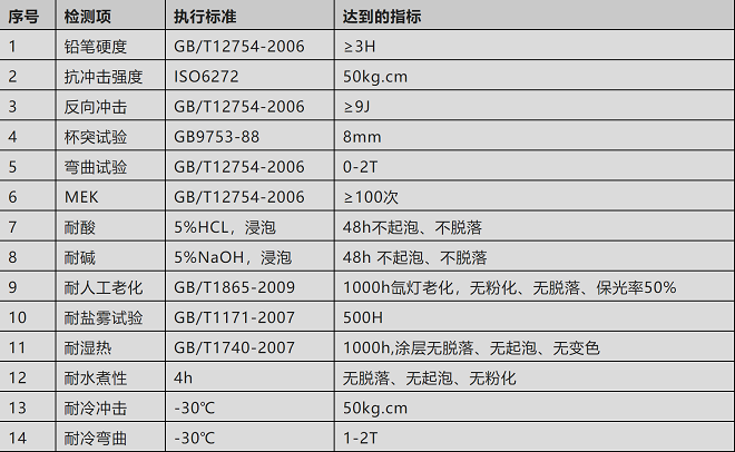 該機組生產的粉末彩塗板各項檢驗指標均達到國家彩塗板標準(表1),其加工性能(折彎、硬度、柔韌性、耐刮等)優於溶劑彩塗板。同時,由於粉末噴塗可實現厚塗,粉末彩塗板的耐候性能亦優於溶劑彩塗板。