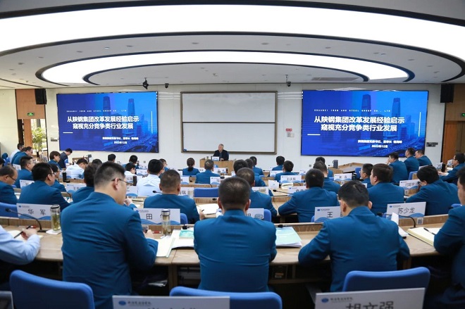 楊海峰以《從陝鋼集團改革發展經驗啟示窺視充分競爭類行業發展》為題從陝鋼的基本情況、陝鋼因改革而生因文化而興的核心要義和陝鋼的未來之路三個方麵進行了全麵係統講述。