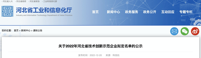 12月20日,河北省工業和信息化廳網站發布了《2022年關於2022年河北省技術創新示範企業擬定名單的公示》(以下簡稱《公示》)。