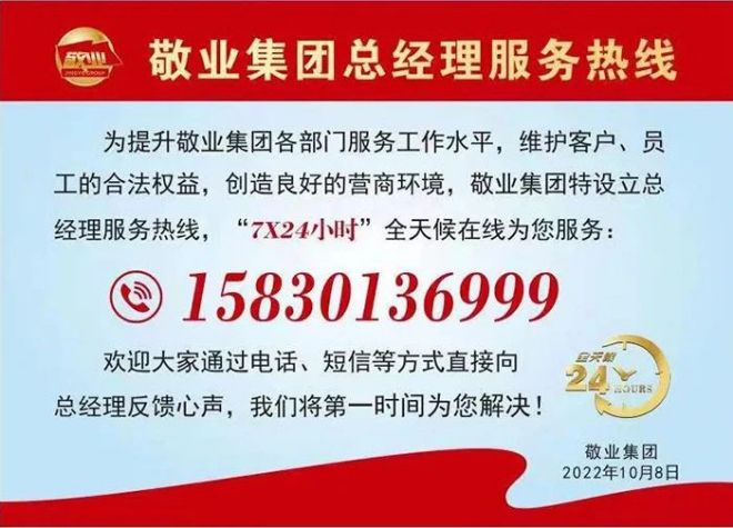 為打造敬業服務品牌,10月9日,敬業集團開通7*24小時總經理服務熱線,自上而下地為客戶解決問題。截至12月25日,共收到信息反饋 692項,解決634項,問題解決率 91.62%,廣受員工、客戶和社會各界讚譽。目前,集團35個單位開通總經理或部長服務熱線。