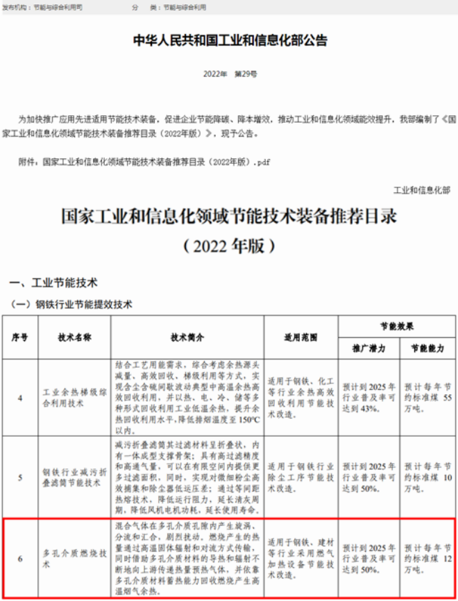 近日,中冶南方熱工公司“多孔介質燃燒技術”通過地方審核推薦、行業協會及中央企業推薦、工信部專家評審等環節層層篩選,經社會公示後,成功入選《國家工業和信息化領域節能技術裝備推薦目錄(2022年版)》。