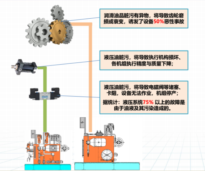 液ye壓ya潤run滑hua係xi統tong油you水shui混hun合he後hou,輕qing則ze造zao成cheng諸zhu如ru軋zha製zhi力li波bo動dong和he軸zhou承cheng壽shou命ming減jian短duan,重zhong則ze引yin起qi火huo災zai等deng重zhong大da安an全quan事shi故gu。中zhong冶ye京jing誠cheng率lv先xian在zai支zhi撐cheng輥gun軸zhou承cheng潤run滑hua係xi統tong和he軋zha機ji液ye壓yaAGC係統等關鍵部位設計智能化油水監測預警係統(圖13、圖14),可以避免出現重大設備和安全事故。該係統具有三大顯著功能: 設備的潤滑磨損安全監測與智能預警、設備在用油汙染狀態監測與調控、油水混合後智能診斷與智能預測。
