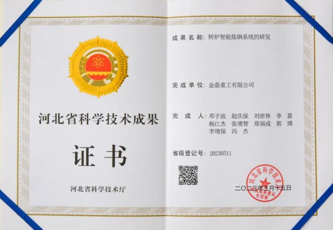 金鼎始終秉持高質量發展之路,致力於自動化、信息化、智能化轉型,近日,公司自主完成的“軋鋼廠高線加熱爐智能化燃燒技術”和“轉爐智能煉鋼係統”順利通過河北省科技成果評價,並取得證書。