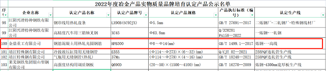 近日,中國鋼鐵工業協會發布2022年度冶金產品實物質量品牌培育認定結果的公示,金鼎申報的鋼筋混凝土用熱軋光圓鋼筋HPB300(線材)產品被冠名為“金杯優質產品”!