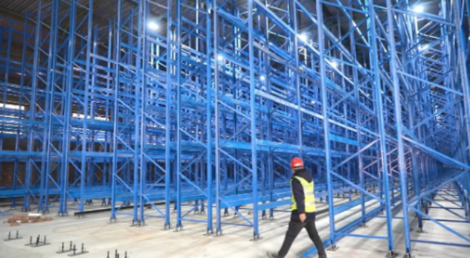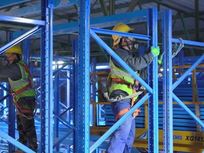 zoujinbaoganggufencangchuzhongxinzhinenglitikugaizaoxiangmudeshigongxianchang,yipianrehuochaotiandejianshejingxiangyingruyanlian,laihuichuansuodejushengchejianghengliangjushengzhianzhuangweizhi,gongzuorenyuanjinzhangmangludijinxingzuzhuang,yipaipaigaodajin8米的貨架構造出一個巨大的立體空間,智能立體庫已初現雛形。