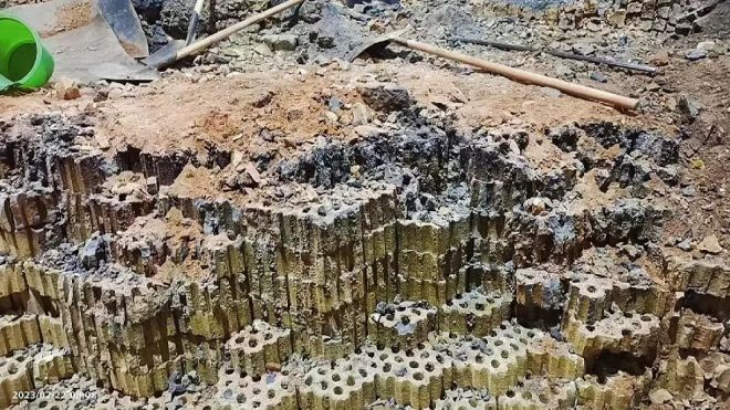 豫興公司技術團隊進熱風爐內查看後發現,蓄熱體格子磚床麵已全部被粉塵及渣蝕堵塞,上部高溫區域格子磚板結為一體,板結厚度約1.5米,且格子磚床麵下沉約2米;支撐拱頂直段的托板及內層爐殼已經嚴重碳化損壞成分層狀和粉末狀,存在極大的安全隱患,不言自明!