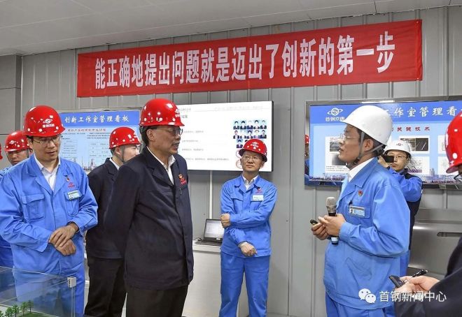 在京唐公司冷軋作業部王保勇創新工作室,牆上懸掛著“能正確地提出問題就是邁出了創新的第一步”“創新工作室管理看板”等標語和展板。趙民革邊看展板,邊聽取崗位人員介紹,不時詢問管理製度建設、激勵機製、師帶徒等情況。他強調,要進一步完善製度建設,努力把創新工作室打造成為職工成長和能力提升的平台。