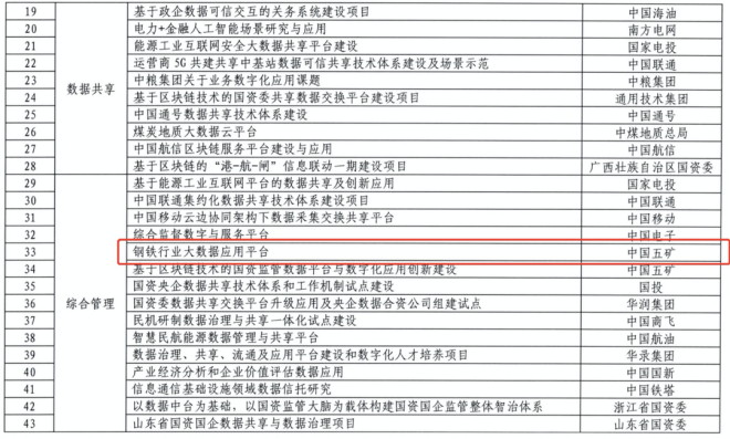 近日,國資委公布《國資央企數據共享技術體係和工作機製試點建設項目清單》,由中國五礦集團推薦的《中冶京誠鋼鐵行業大數據應用平台》成功入選。