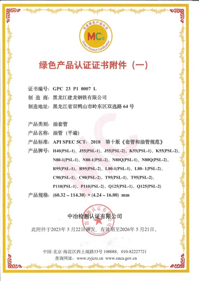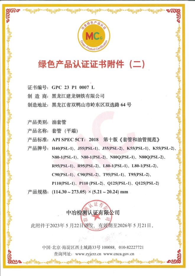 黑龍江建龍油套管產品榮獲“綠色產品”認證