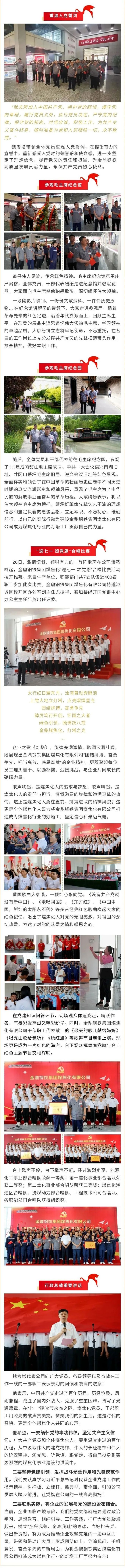 為慶祝中國共產黨成立102周zhou年nian,重zhong溫wen黨dang的de光guang輝hui曆li史shi,繼ji承cheng和he發fa揚yang黨dang的de光guang榮rong傳chuan統tong和he優you良liang作zuo風feng,激ji勵li廣guang大da黨dang員yuan在zai金jin鼎ding鋼gang鐵tie發fa展zhan道dao路lu上shang不bu斷duan踔chuo厲li奮fen發fa,勇yong毅yi前qian行xing,奮fen力li譜pu寫xie新xin篇pian章zhang,在zai“七一”建黨節來臨之際, 金鼎鋼鐵集團煤焦化有限公司組織開展“迎七一 頌黨恩”係列慶祝活動。金鼎鋼鐵集團煤焦化有限公司總裁魏鬆波,行政總裁魏考增,副總裁吳映忠、孟學鋼等領導出席活動。