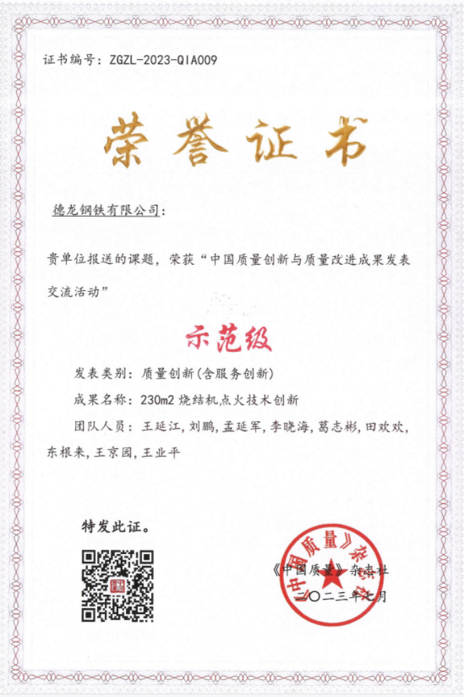 近日,在中國質量協會主辦的“中國質量創新與質量改進成果發表交流活動”中,德龍鋼鐵《230m2燒結機點火技術創新》與《基於高效軋製的熱軋產線軋輥綜合利用率研究與應用》兩大技術創新項目,憑借在質量創新方麵的新穎性、實用性及有效性等,獲得評審專家的一致好評,經材料評選和現場發表,分別被評為“國家示範級質量創新成果”與“國家專業級質量創新成果”,充分展現了公司在工藝改進、技術突破、管理提升等方麵不斷突破、持續進取的創新精神。