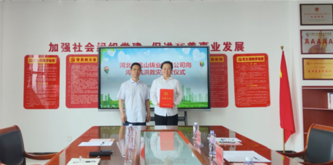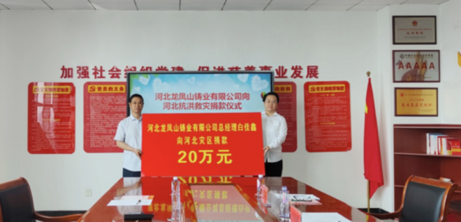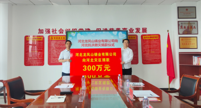 河北龍鳳山鑄業有限公司總經理白佳鑫在捐贈儀式上發表講話。她說,7月底至8月初,受台風“杜蘇芮”影響,河北省遭受罕見的特大暴雨洪水災害。“一方有難,八方支援”是中華民族的優良傳統,河北龍鳳山鑄業有限公司領導和全體職工牽掛災區群眾,董事會研究決定為災區捐贈300萬元善款。我們堅信,這份愛心能夠為災區群眾帶去溫暖、帶去堅強、帶去信心、帶去激勵。同時,也祝願災區人民早日走出災難陰霾,重建美好家園!