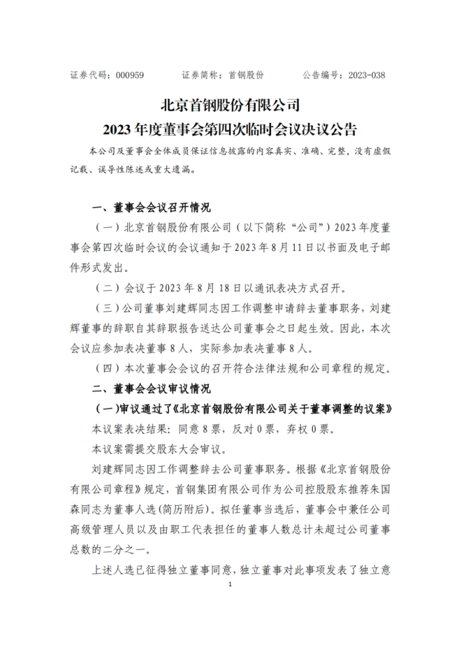 首鋼股份2023年度董事會第四次臨時會議8月18日以通訊表決方式召開,會議審議通過了《北京首鋼股份有限公司關於董事調整的議案》《北京首鋼股份有限公司關於總經理調整的議案》,董事會同意聘任朱國森同誌為公司總經理,聘任劉同合同誌為公司總會計師。