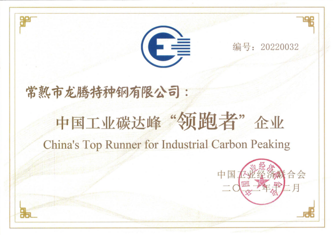 龍騰特鋼榮獲首屆“中國工業碳達峰‘領跑者’企業”榮譽稱號