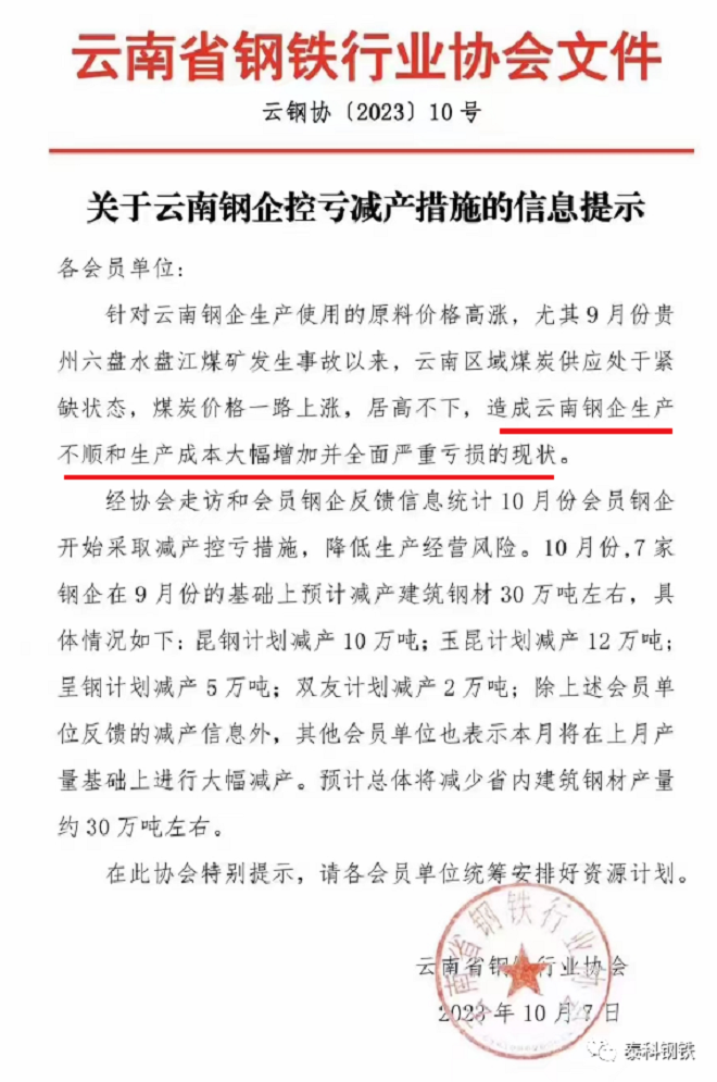 雲南省鋼鐵工業協會於10月7日發布《關於雲南鋼企控虧減產措施的信息提示》:針對雲南鋼企生產使用的原料價格高漲,尤其9yuefenguizhouliupanshuipanjiangmeikuangfashengshiguyilai,yunnanquyumeitangongyingchuyujinquezhuangtai,meitanjiageyilushangzhang,jugaobuxia,zaochengyunnangangqishengchanbushunheshengchanchengbendafuzengjiabingquanmianyanzhongkuisundexianzhuang。10月份,7家鋼企在9月份的基礎上預計減產建築鋼材30萬噸左右,具體情況如下:昆鋼計劃減產10萬噸;玉昆計劃減產12萬噸;呈鋼計劃減產5萬噸;雙友計劃減產2萬噸;除上述會員單位反饋的減產信息外,其他會員單位也表示本月將在上月產量基礎上進行大幅減產。預計總體將減少省內建築鋼材產量約30萬噸左右。