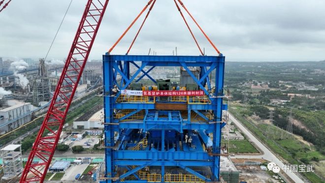 2023年4月27日清晨6點28分,氫基豎爐塔頂最後一段鋼結構開始吊裝,曆時1個多小時的吊運,順利抵達豎爐塔121.1米高度位置並成功吊裝到位,氫基豎爐本體鋼結構順利封頂。