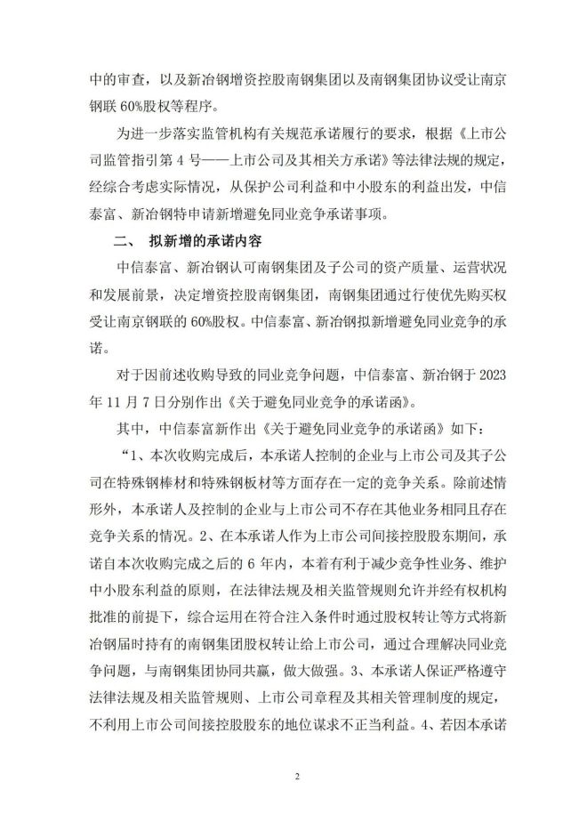 為進一步落實監管機構有關規範承諾履行的要求,根據《上市公司監管指引第 4 號——上市公司及其相關方承諾》等法律法規的規定,經綜合考慮實際情況,從保護公司利益和中小股東的利益出發,中信泰富、新冶鋼特申請新增避免同業競爭承諾事項。