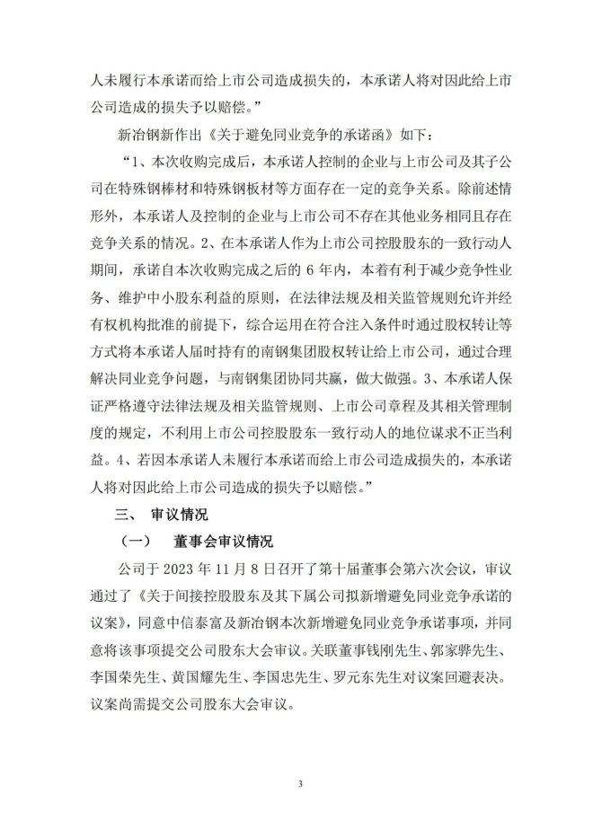 對於因前述收購導致的同業競爭問題,中信泰富、新冶鋼於 2023年 11 月 7 日分別作出《關於避免同業競爭的承諾函》。