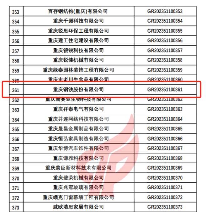 11月7日,全國高新技術企業認定管理工作領導小組辦公室發布《重慶市認定機構2023年認定報備的第一批高新技術企業備案名單》,重慶鋼鐵順利通過2023年“高新技術企業”認證。