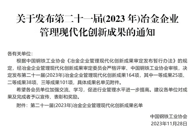 冶金企業管理現代化創新成果由中國鋼鐵工業協會設立、審定,專門為推動、總結、推廣、應用企業管理現代化創新成果提供平台,旨在鼓勵企業管理改革與創新、促進鋼鐵工業健康可持續發展。該獎項每年征集、審定、表彰一次,是冶金管理最高獎項。