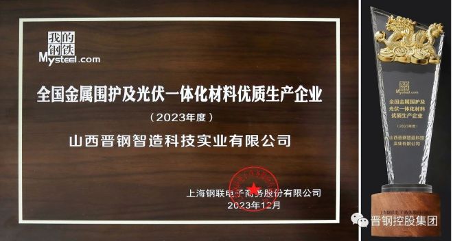 晉鋼集團榮獲“2023年全國金屬圍護及光伏一體化材料優質生產企業”稱號