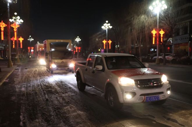 12月22日清晨,寧鋼集團救援車隊第二站到達青海民和回族土族自治縣川口鎮邊牆村,排隊等待移交物資。