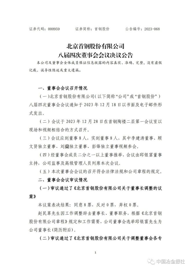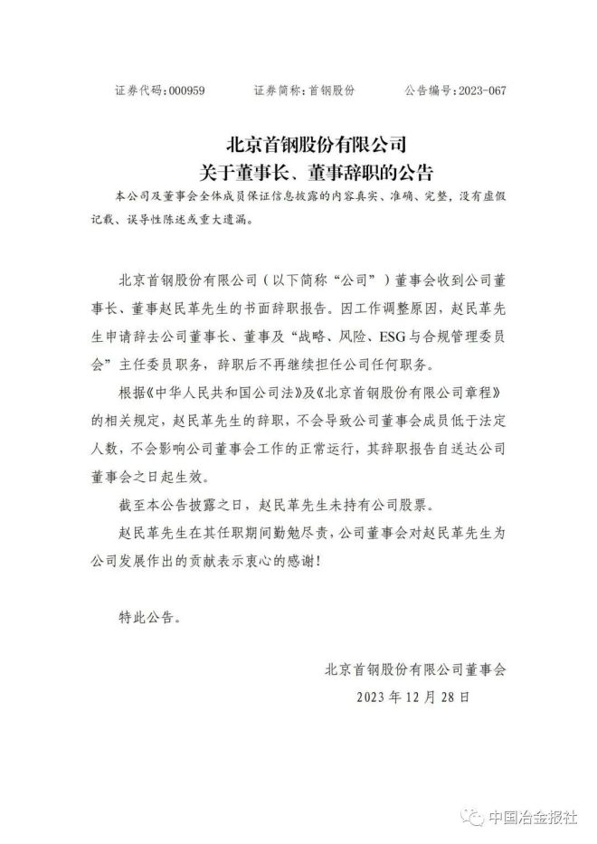 2023年12月28日晚,首鋼股份(000959.SZ)發布公告稱,因工作調整原因,趙民革申請辭去公司董事長、董事及“戰略、風險、ESG與合規管理委員會”主任委員職務,辭職後不再擔任公司任何職務。根據首鋼股份董事會決議,邱銀富接替趙民革成為首鋼股份新一任董事長。