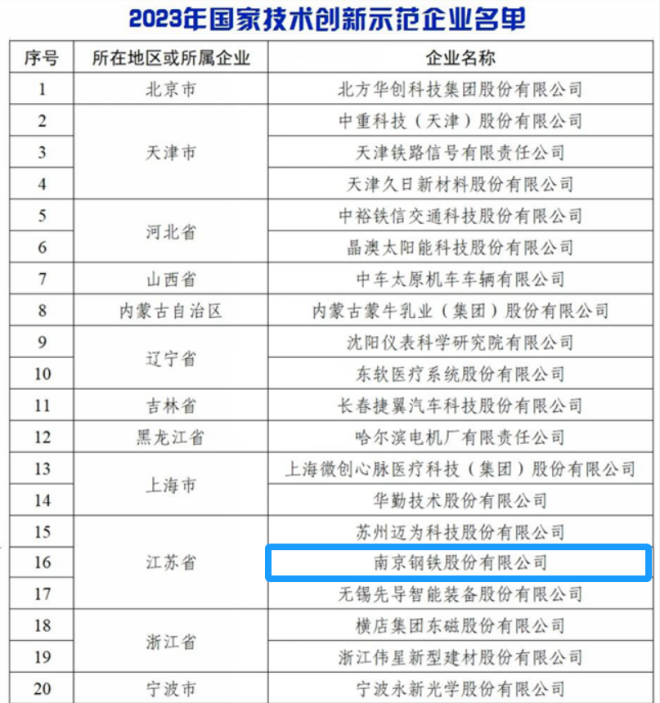 1月17日,國家工信部網站發布2023年國家技術創新示範企業評定名單,南京鋼鐵股份有限公司榜上有名。